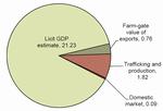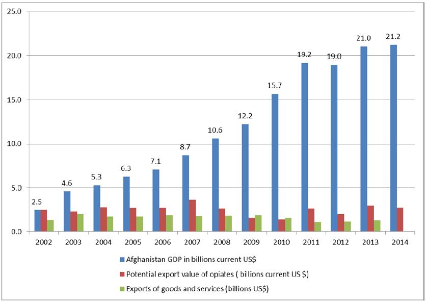 Figure 1: Afghanistan GDP, potential export value of opiates and value of Afghan exports of goods and services (US dollars (billions))
