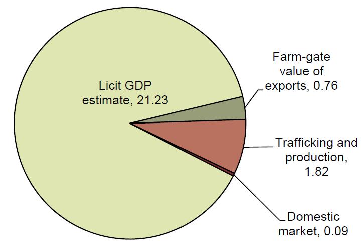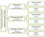 - Despite a decrease of almost 9% from the previous year (to US$ 2.84 billion) in the estimated potential gross value of opiates in Afghanistan, opiates still constituted a sizeable share of Afghanistan's economy in 2014. Accounting for 13% of the country's GDP, the value of opiates considerably exceeded the value of the export of licit goods and services in 2014, while the cultivation and production of Afghan opium actually increased from their 2013 levels. The total area under opium poppy cultivation was estimated at 224,000 hectares, a 7% increase from the previous year, whereas potential opium production was estimated at 6,400 tons, an increase of 17% from its 2013 level (5,500 tons) and the second highest level since 1994. |7|