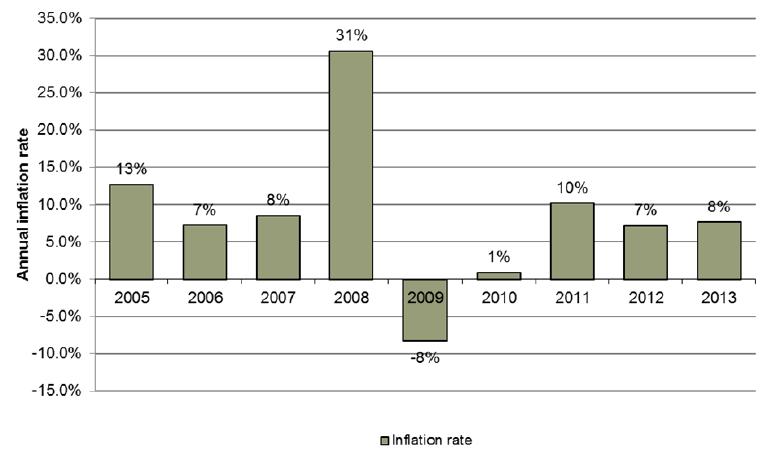 Due to the availability of data, the base year is 2004 and the time period considered is from 2004 to 2013. With a 2004 base year, inflation adjustment looks at all values in terms of the purchasing power of the equivalents of local currency to 1 US$ in 2004. Inflation rates usually refer to local currencies. However, for ease of comparison, US dollar values are kept, to which the Afghan inflation rate is applied.