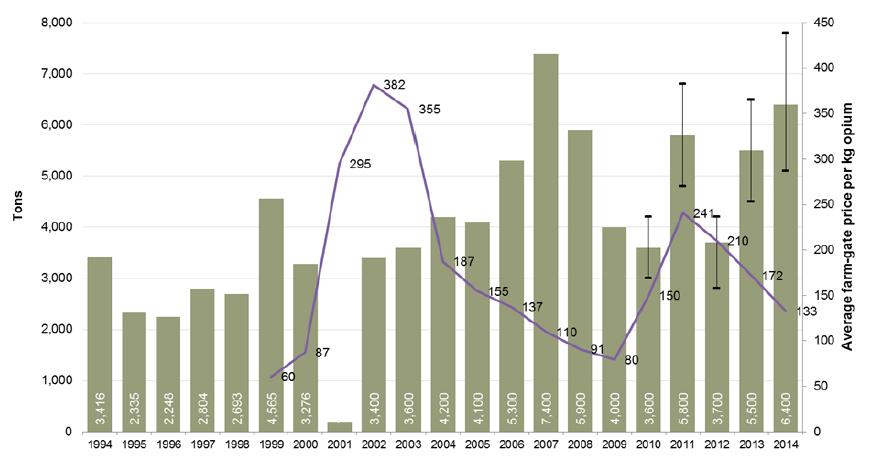Figure 2: Average nominal farm-gate prices of dry opium in US dollars (purple line) together with annual opium production (green bars)