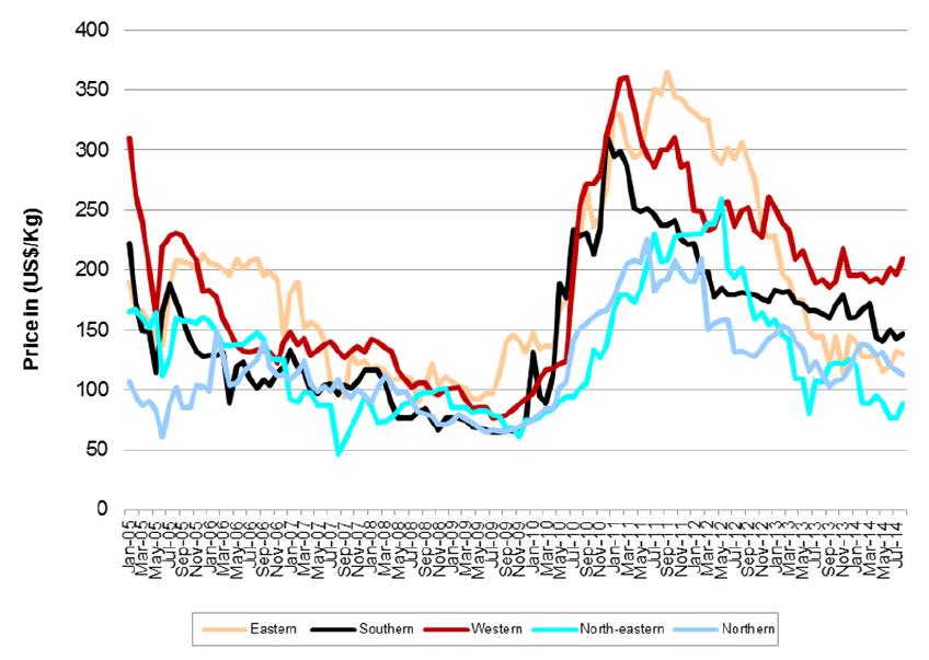Figure 3: Regional average price of dry opium reported by traders, January 2005-October 2013 (US dollars per kilogram)