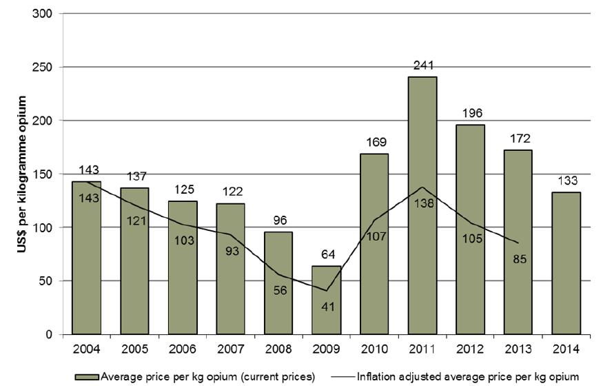 Figure 4: Average nominal (current) farm-gate prices of dry opium (US dollars: green bars) and prices adjusted for inflation (constant prices adjusted to 2004 price: line)