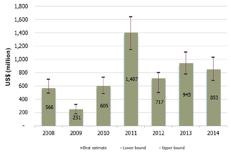 Figure 8: Potential gross export value of opiate production, and farm-gate value, 2000-2014 (US dollars)