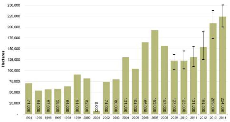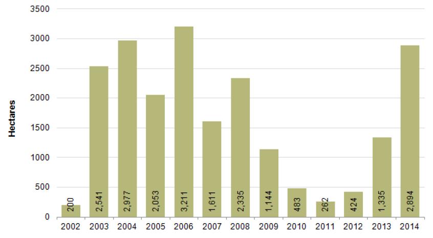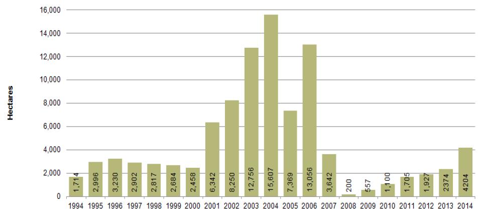 Figure 2: Opium cultivation in Nangarhar province, 1994-2014 (Hectares)