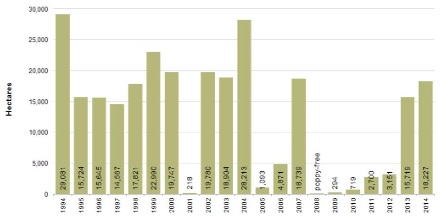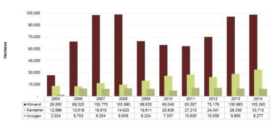 - The total area under opium poppy cultivation in Afghanistan was estimated at 224,000 hectares in 2014, a 7% increase from the previous year.
