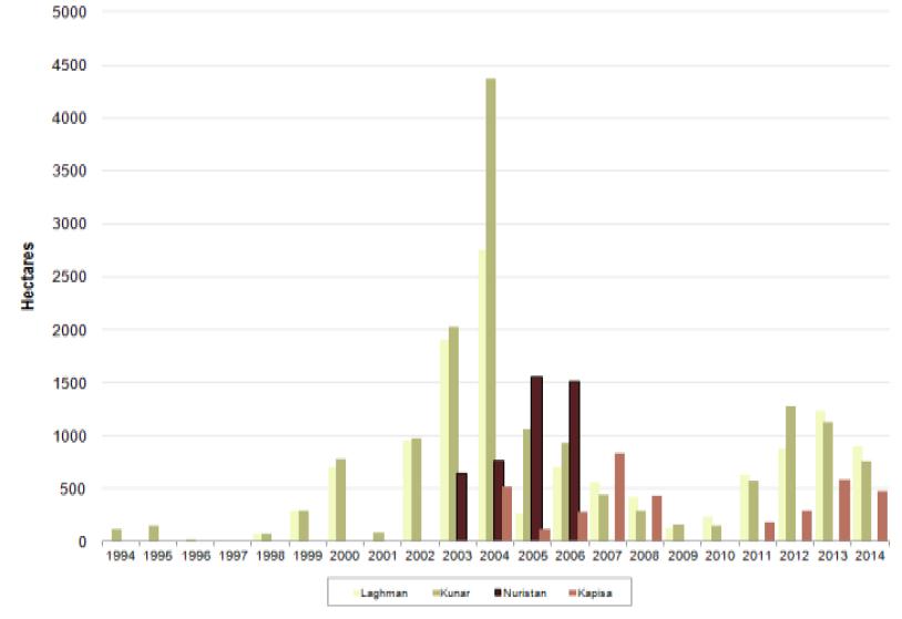 Figure 3: Opium cultivation in Laghman, Kunar, Nuristan and Kapisa provinces, 1994-2014 (Hectares)
