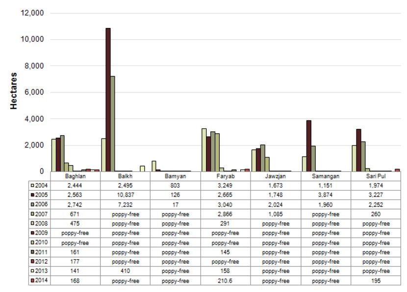 PROVINCE 2002 2003 2004 2005 2006 2007 2008 2009 2010 2011 2012 2013 2014 Change 2013-2014 (ha) Change 2013-2014 (%) Badakhshan 8,250 12,756 15,607 7,370 13,056 3,642 200 557 1,100 1,705 1,927 2,374 4,204 +1830 +77% Badghis 26 170 614 2,967 3,205 4,219 587 5,411 2,958 1,990 2,363 3,596 5,721 +2125 +59% Baghlan 152 597 2,444 2,563 2,742 671 475 Poppy-free Poppy-free 161 177 141 168 +27 +19% Balkh 217 1,108 2,495 10,837 7,232 - Poppy-free Poppy-free Poppy-free Poppy-free Poppy-free 410 Poppy-free -410 NA Bamyan - 610 803 126 17 - Poppy-free Poppy-free Poppy-free Poppy-free Poppy-free Poppy-free Poppy-free NA NA Day Kundi - 2,445 3,715 2,581 7,044 3,346 2,273 3,002 1,547 1,003 1,058 1,536 587 -949 -62% Farah 500 1,700 2,288 10,240 7,694 14,865 15,010 12,405 14,552 17,499 27,733 24,492 27,513 +3021 +12% Faryab 28 766 3,249 2,665 3,040 2,866 291 Poppy-free Poppy-free Poppy-free Poppy-free 158 211 +53 +33% Ghazni - - 62 9 - - Poppy-free Poppy-free Poppy-free 145 Poppy-free Poppy-free Poppy-free NA NA Ghor 2,200 3,782 4,983 2,689 4,679 1,503 Poppy-free Poppy-free Poppy-free Poppy-free 125 264 493 +229 +87% Hilmand 29,950 15,371 29,353 26,500 69,324 102,770 103,590 69,883 65,045 63,307 75,176 100,693 103,240 +2547 +3% Hirat 50 134 2,531 1,924 2,287 1,525 266 556 360 366 1,080 952 738 -214 -22% Jawzjan 137 888 1,673 1,748 2,024 1,085 Poppy-free Poppy-free Poppy-free Poppy-free Poppy-free Poppy-free Poppy-free NA NA Kabul 58 237 282 - 80 500 310 132 152 220 120 298 233 -65 -22% Kandahar 3,970 3,055 4,959 12,989 12,619 16,615 14,623 19,811 25,835 27,213 24,341 28,335 33,713 +5378 +19% Kapisa 207 326 522 115 282 835 436 Poppy-free Poppy-free 181 290 583 472 -111 -19% Khost - 375 838 2 133 - Poppy-free Poppy-free Poppy-free Poppy-free Poppy-free Poppy-free Poppy-free NA NA Kunar 972 2,025 4,366 1,059 932 446 290 164 154 578 1,279 1,127 754 -373 -33% Kunduz 16 49 224 275 102 - Poppy-free Poppy-free Poppy-free Poppy-free Poppy-free Poppy-free Poppy-free NA NA Laghman 950 1,907 2,756 274 710 561 425 135 234 624 877 1,236 901 -335 -27% Logar - - 24 - - - Poppy-free Poppy-free Poppy-free Poppy-free Poppy-free Poppy-free Poppy-free NA NA Nangarhar 19,780 18,904 28,213 1,093 4,872 18,739 0 294 719 2,700 3,151 15,719 18,227 +2508 +16% Nimroz 300 26 115 1,690 1,955 6,507 6,203 428 2,039 2,493 3,808 16,252 14,584 -1668 -10% Nuristan - 648 764 1,554 1,516 0 Poppy-free Poppy-free Poppy-free Poppy-free Poppy-free Poppy-free Poppy-free NA NA Paktika - - - - - - Poppy-free Poppy-free Poppy-free Poppy-free Poppy-free Poppy-free Poppy-free NA NA Paktya 38 721 1,200 - - - Poppy-free Poppy-free Poppy-free Poppy-free Poppy-free Poppy-free Poppy-free NA NA Panjshir - - - - - - Poppy-free Poppy-free Poppy-free Poppy-free Poppy-free Poppy-free Poppy-free NA NA Parwan - - 1,310 - 124 - Poppy-free Poppy-free Poppy-free Poppy-free Poppy-free Poppy-free Poppy-free NA NA Samangan 100 101 1,151 3,874 1,960 - Poppy-free Poppy-free Poppy-free Poppy-free Poppy-free Poppy-free Poppy-free NA NA Sari Pul 57 1,428 1,974 3,227 2,252 260 Poppy-free Poppy-free Poppy-free Poppy-free Poppy-free Poppy-free 195 NA NA Takhar 788 380 762 1,364 2,178 1,211 Poppy-free Poppy-free Poppy-free Poppy-free Poppy-free Poppy-free Poppy-free NA NA Uruzgan 5,100 4,698 7,365 2,024 9,703 9,204 9,939 9224 7,337 10,620 10,508 9,880 9,277 -603 -6% Wardak - 2,735 1,017 106 - - Poppy-free Poppy-free Poppy-free Poppy-free Poppy-free Poppy-free Poppy-free NA NA Zabul 200 2,541 2,977 2,053 3,210 1,611 2,335 1,144 483 262 424 1,335 2,894 +1559 +117% Total (rounded) 74,000 80,000 131,000 104,000 165,000 193,000 157,000 123,000 123,000 131,000 154,000 209,000 244,00 +15,000 +7%