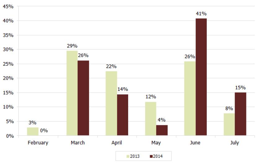 Figure 12: Area of opium poppy eradication, per month, 2013-2014 (Percentage of total)