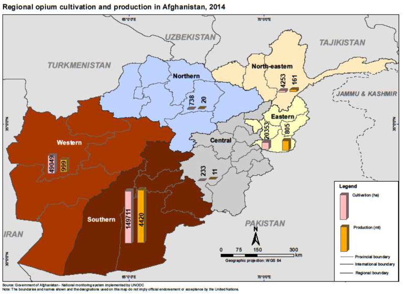 - Accounting for 69% of national production, the Southern region continued to produce the vast majority of opium in Afghanistan. With 16% of national production, the Western region was the country's second most important opium-producing region in 2014.