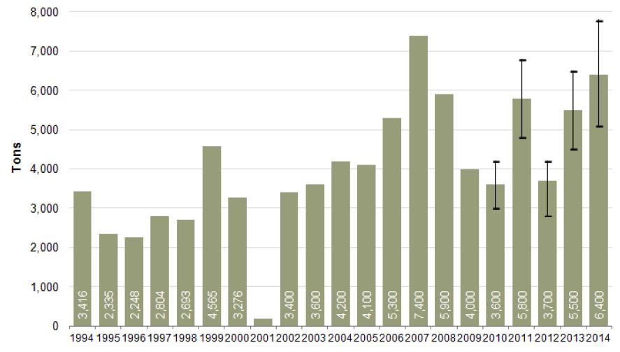 Figure 13: Potential opium production in Afghanistan, 1997-2014 (Tons)