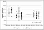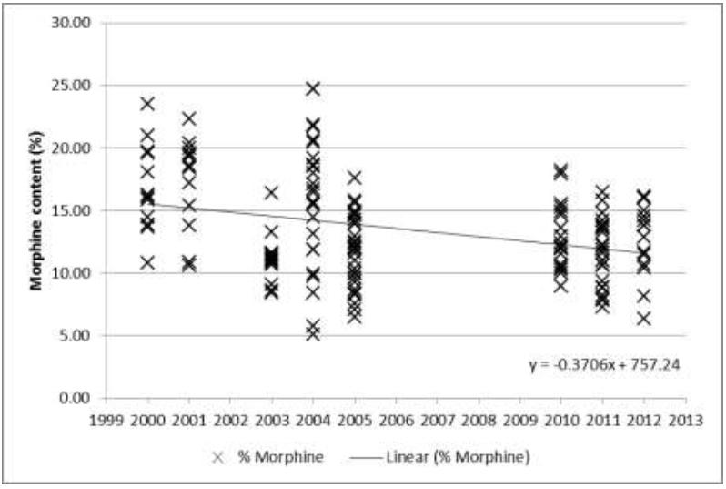 Figure 14: Morphine content (%) of all samples analysed between 2000 and 2012, with linear trend line