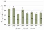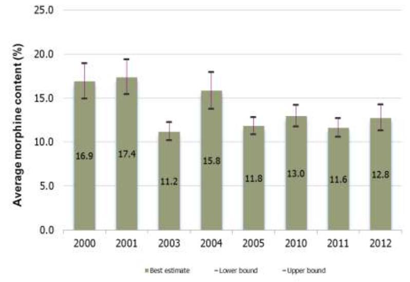 Figure 15: Average morphine content (%) in Afghan samples of oven-dry opium gum, 2000-2012