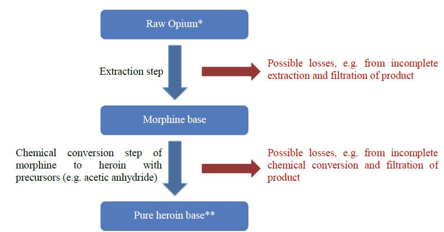 The proportion of opium converted into morphine and heroin was derived from seizure data in Afghanistan and its neighbouring countries. A three-year average of all reported amounts was taken. In order to estimate the share of opium converted to heroin, all heroin and morphine seizures are converted into opium equivalents by applying the opium to heroin conversion ratio for heroin of export quality.