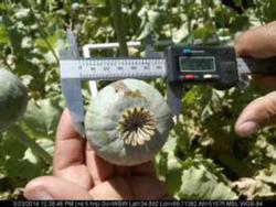 An imaginary transect was drawn on each surveyed field, along which three one-metre square plots were selected. In each plot, the number of flower buds, flowers, immature capsules and mature capsules that were expected to yield opium were counted, and the diameter and height of 10 to 15 opium-yielding capsules were measured with a calliper. The capsule volume per square metre was calculated with these data and entered into the formula for the yield calculation. Each plot thus provided one yield observation. The simple average of the three plots in a field is the field yield. The simple average of all fields in a region is the regional yield. A range was calculated to express the uncertainty of the yield estimate due to sampling with the 95% confidence interval.