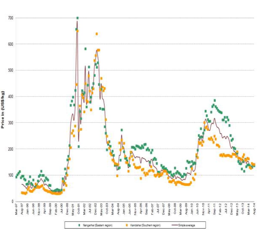 Figure 19: Monthly prices of dry opium in Kandahar and Nangarhar province, as collected from March 1997 to August 2014 (US dollars per kilogram)