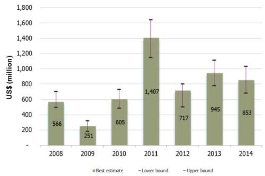 Figure 20: Farm-gate value of opium production in Afghanistan, 2008-2013 (Million US dollars)
