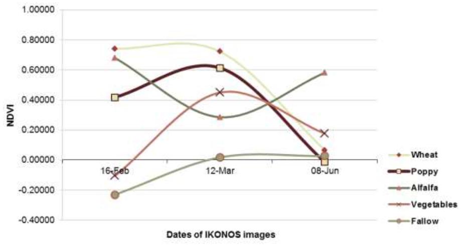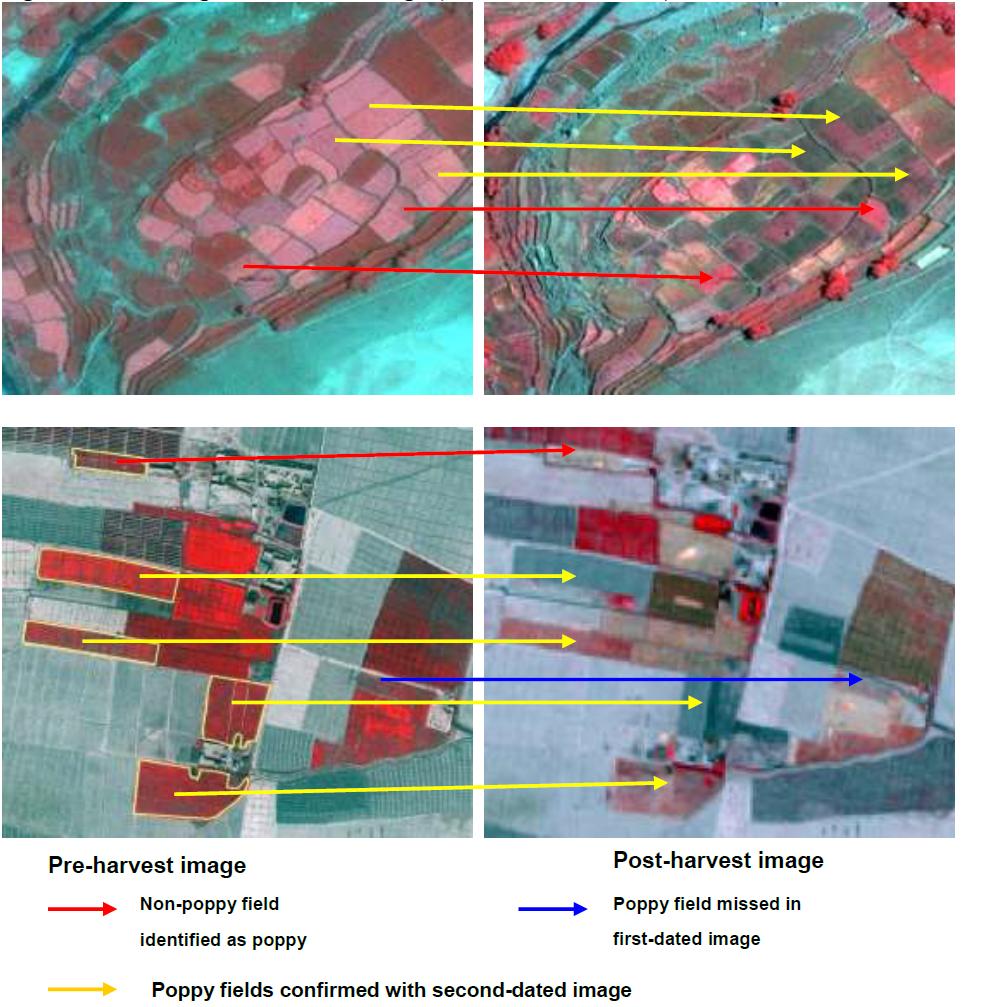 Some of the images could not be acquired at the appropriate time due to weather conditions and/or the time at which the satellite passed. The delayed acquisition of images makes it difficult to detect opium poppy, since fields may be at the senescence stage due to the lancing of capsules and can therefore be confused with fallow fields. In such cases, second-dated images are often useful in confirming opium poppy fields, since harvest patterns are different for wheat and opium poppy.