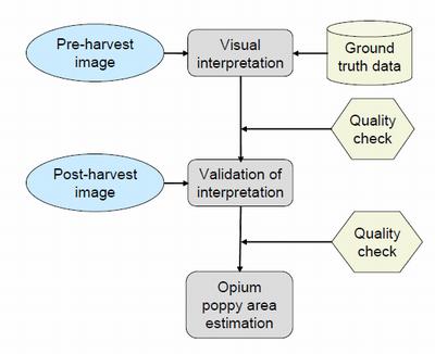 All fields determined as likely to be under opium cultivation (potential opium poppy fields) were delineated on the basis of the interpretation of first-dated satellite imagery. In some cases a second-dated image was acquired for the purpose of confirmation. The corrections involved a few commissions and omissions.