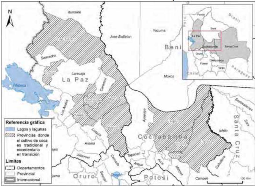 Figura 1. Provincias donde el cultivo de coca es tradicional y excedentario en transición de acuerdo con la Ley 1008
