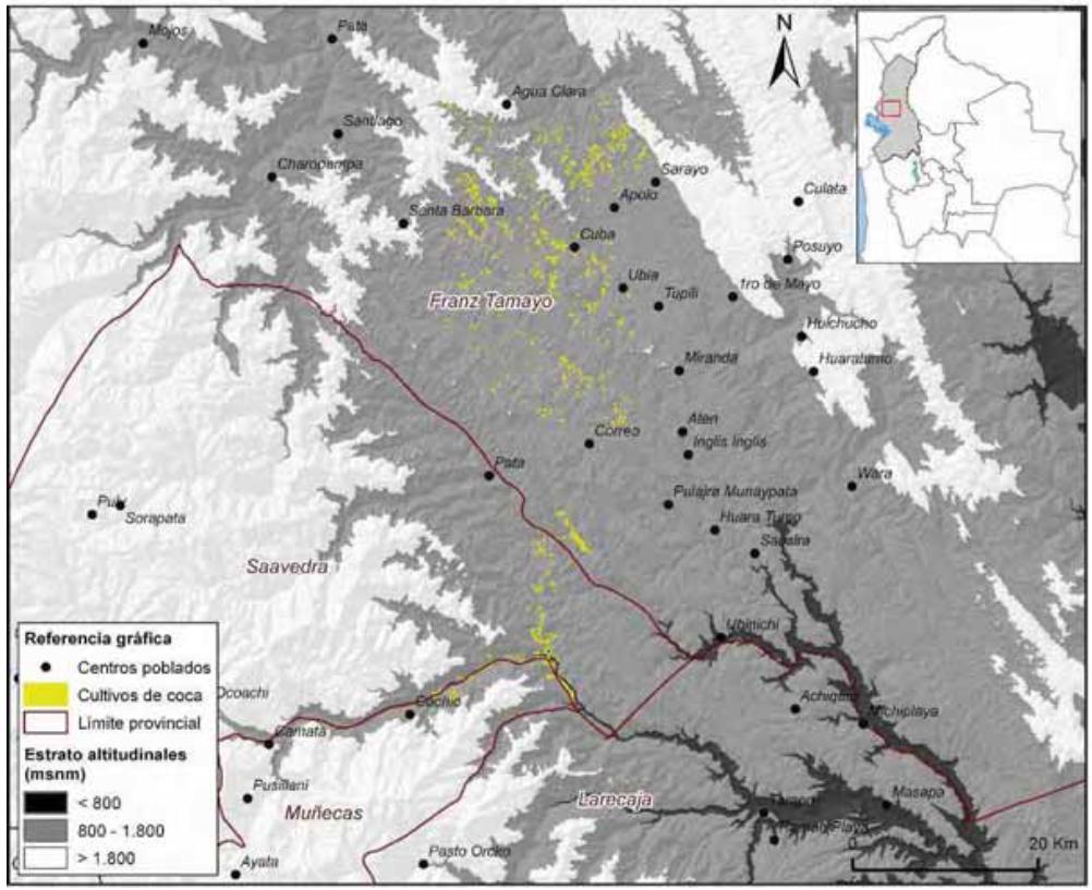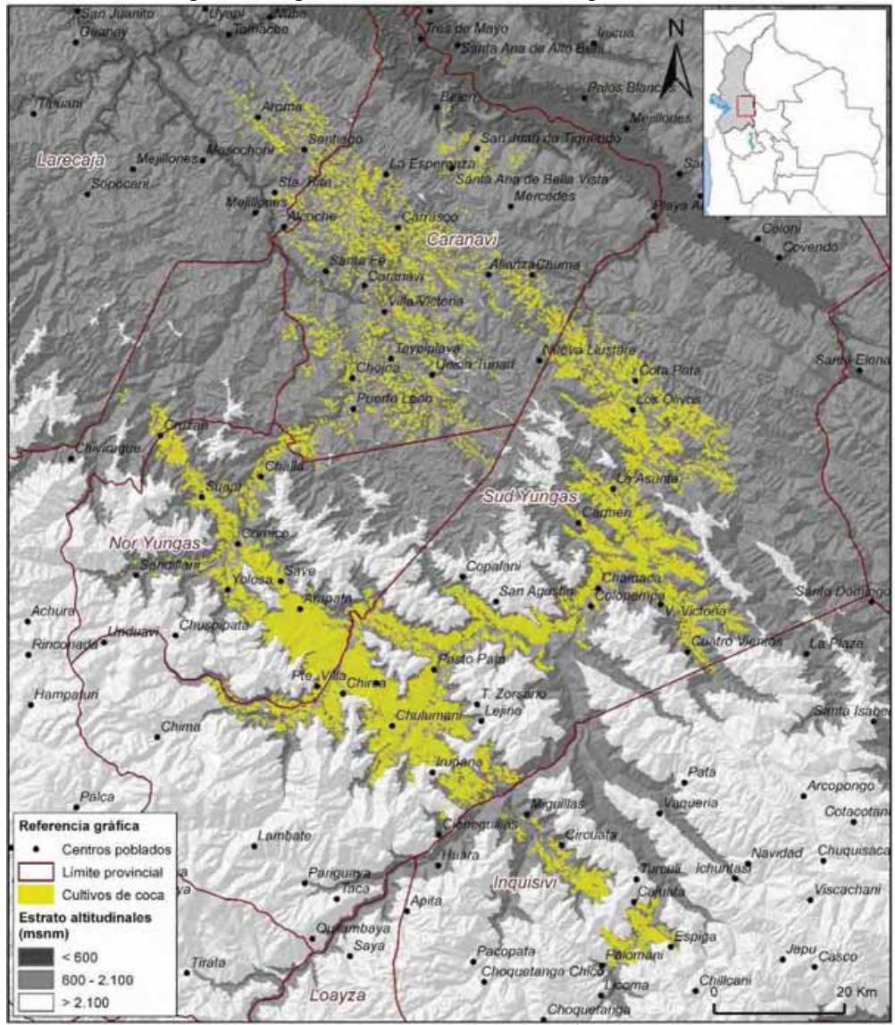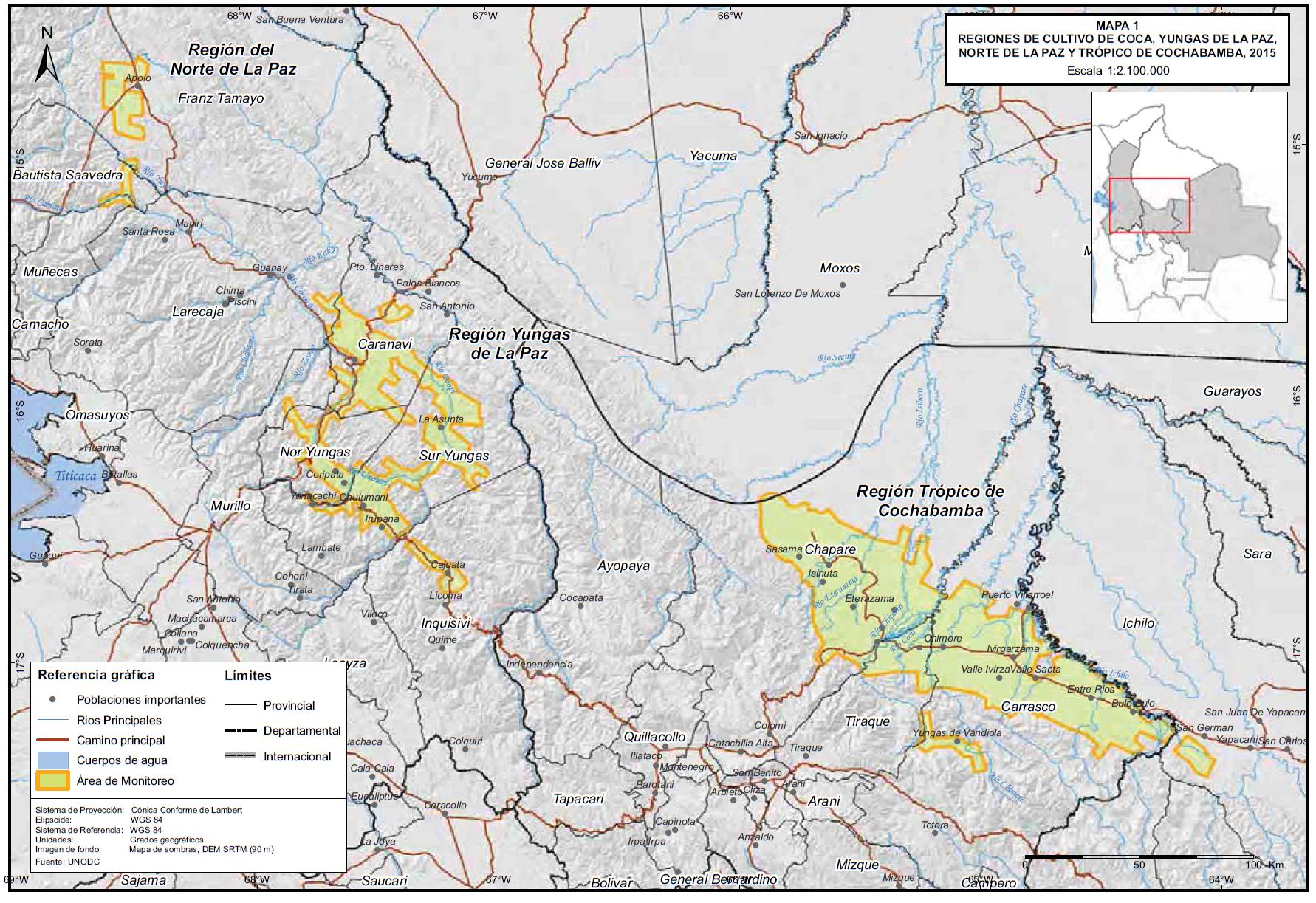 Mapa 1. Regiones de cultivos de coca Yungas de La Paz, Norte de La Paz y Trópico de Cochabamba, 2015