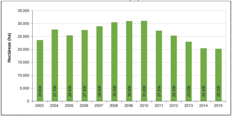 Figura 8. Datos históricos de la superficie de cultivos de coca en Bolivia, 2003 -2015 (ha)