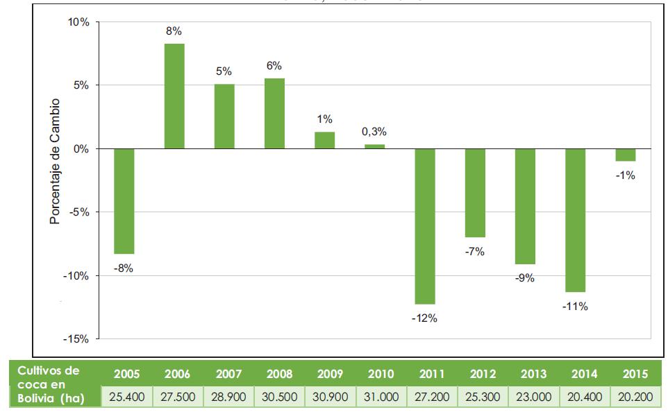 Figura 9. Tasa anual de variación de la superficie con cultivos de coca en Bolivia, 2003 - 2015