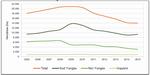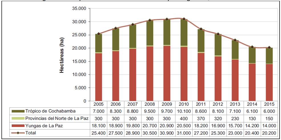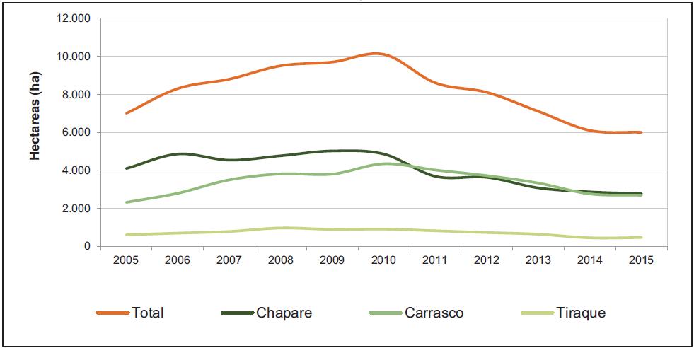 Figura 14. Tendencia de los cultivos de coca en las provincias productoras del Trópico de Cochabamba, 2005 -2015