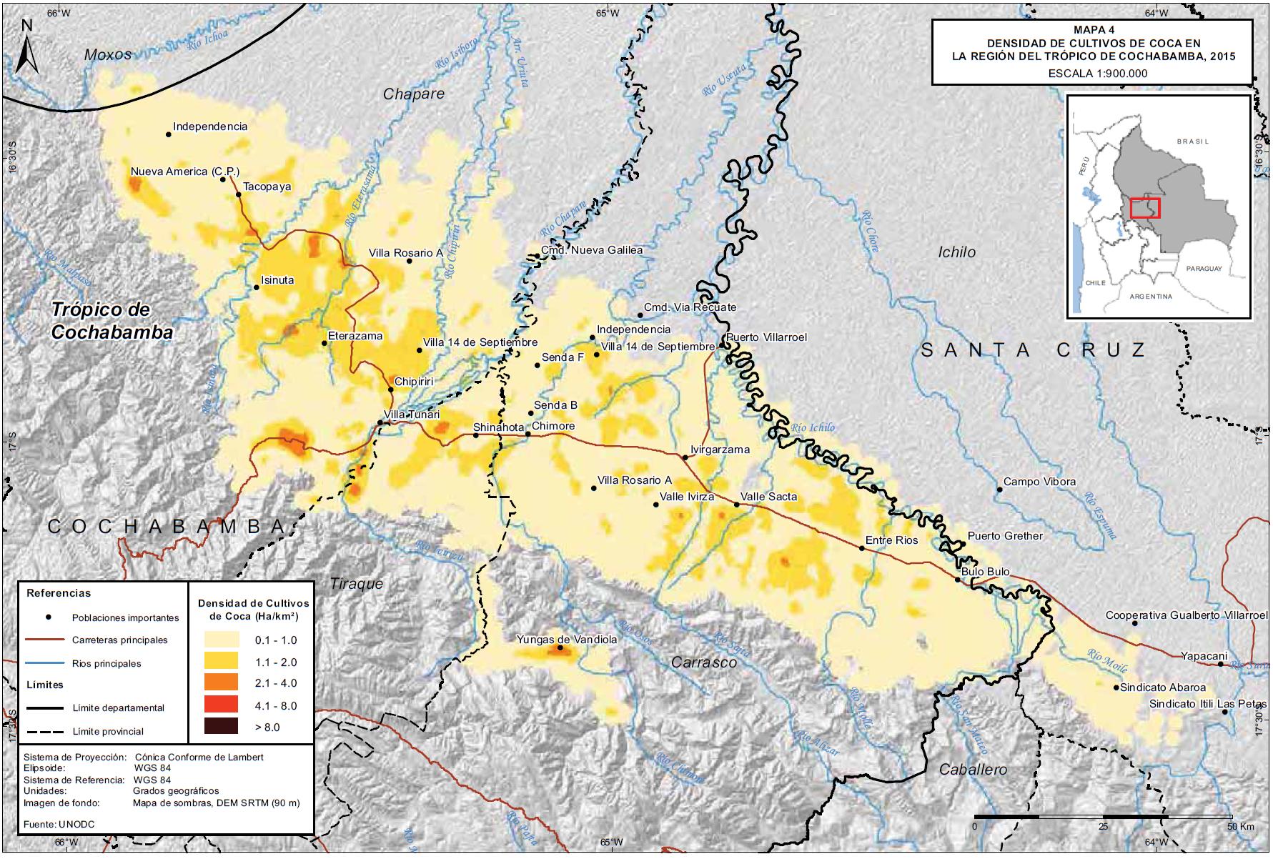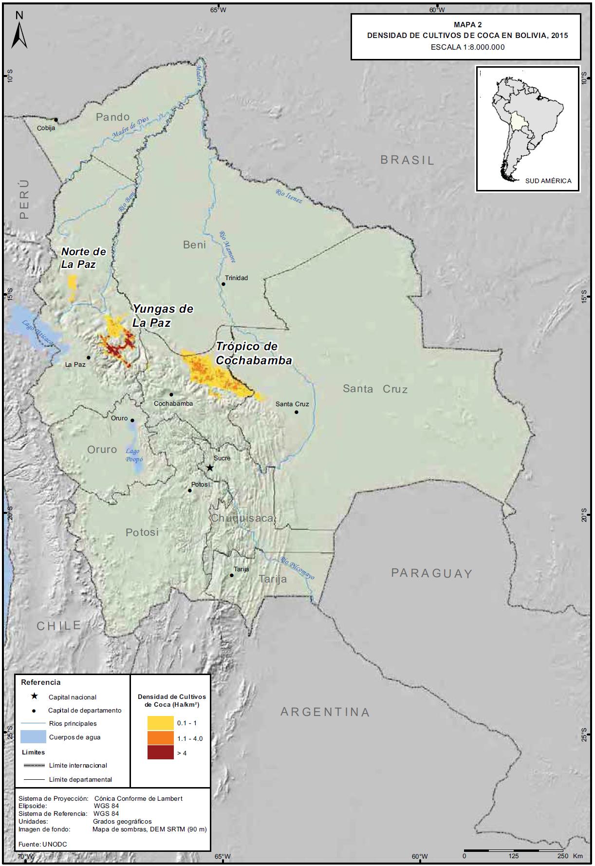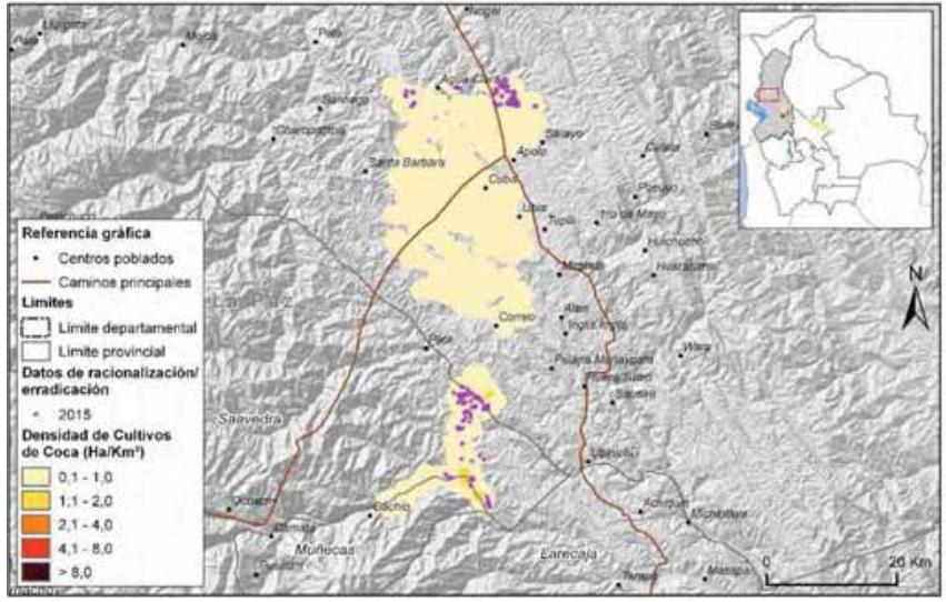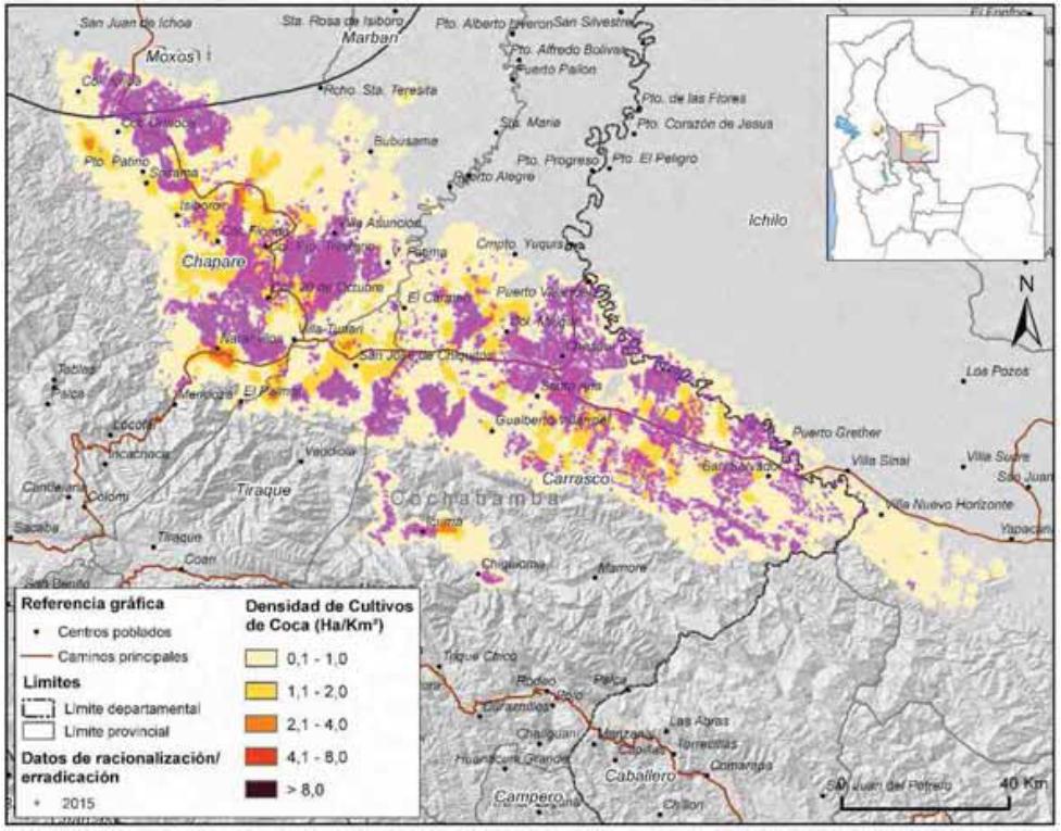 Mapa 2. Densidad de cultivos de coca en Bolivia, 2015