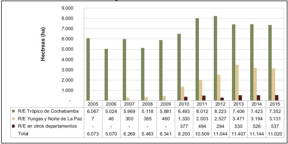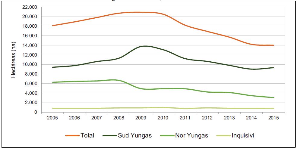 Figura 11. Tendencias de los cultivos de coca en las provincias productoras de los Yungas de La Paz, 2005-2015