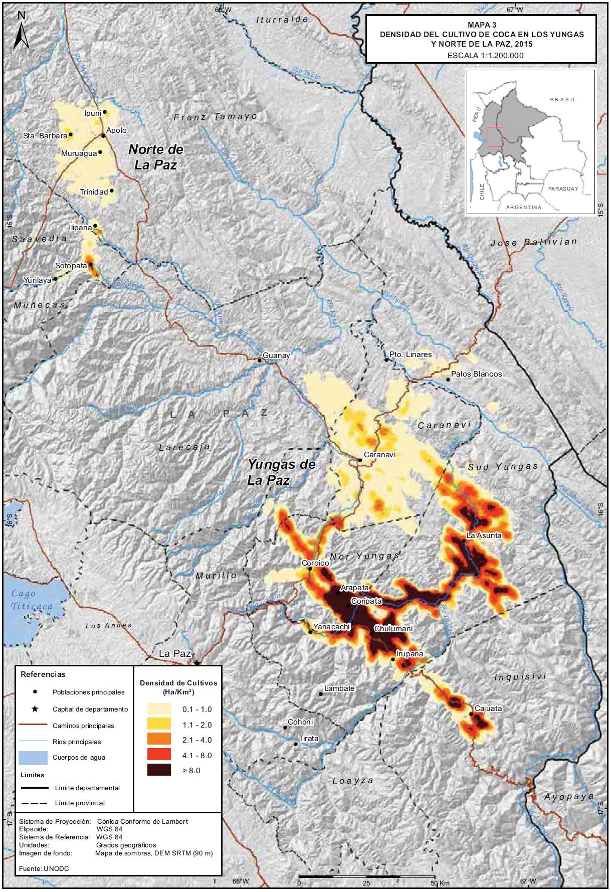 Mapa 3. Densidad de cultivos de coca en la región de los Yungas y provincias del Norte de La Paz, 2015