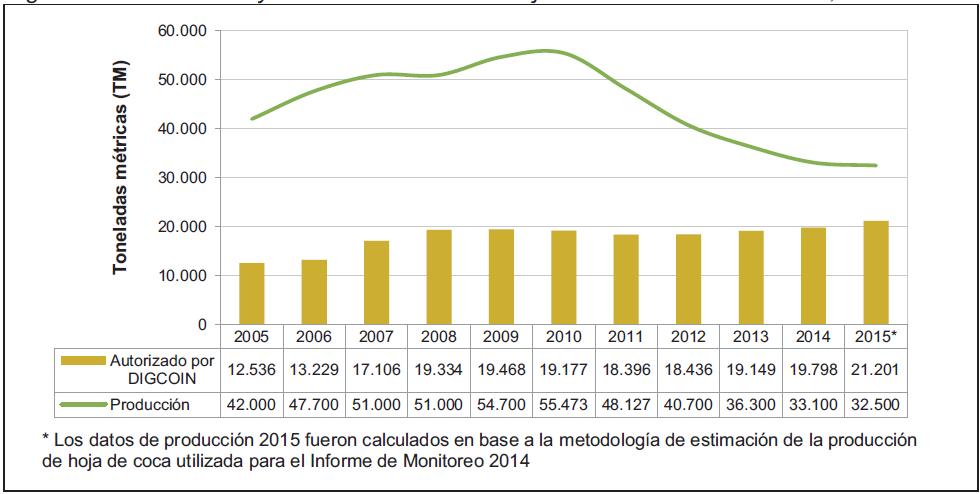 Figura 22. Producción y comercialización de hoja de coca a nivel nacional, 2005 -2015