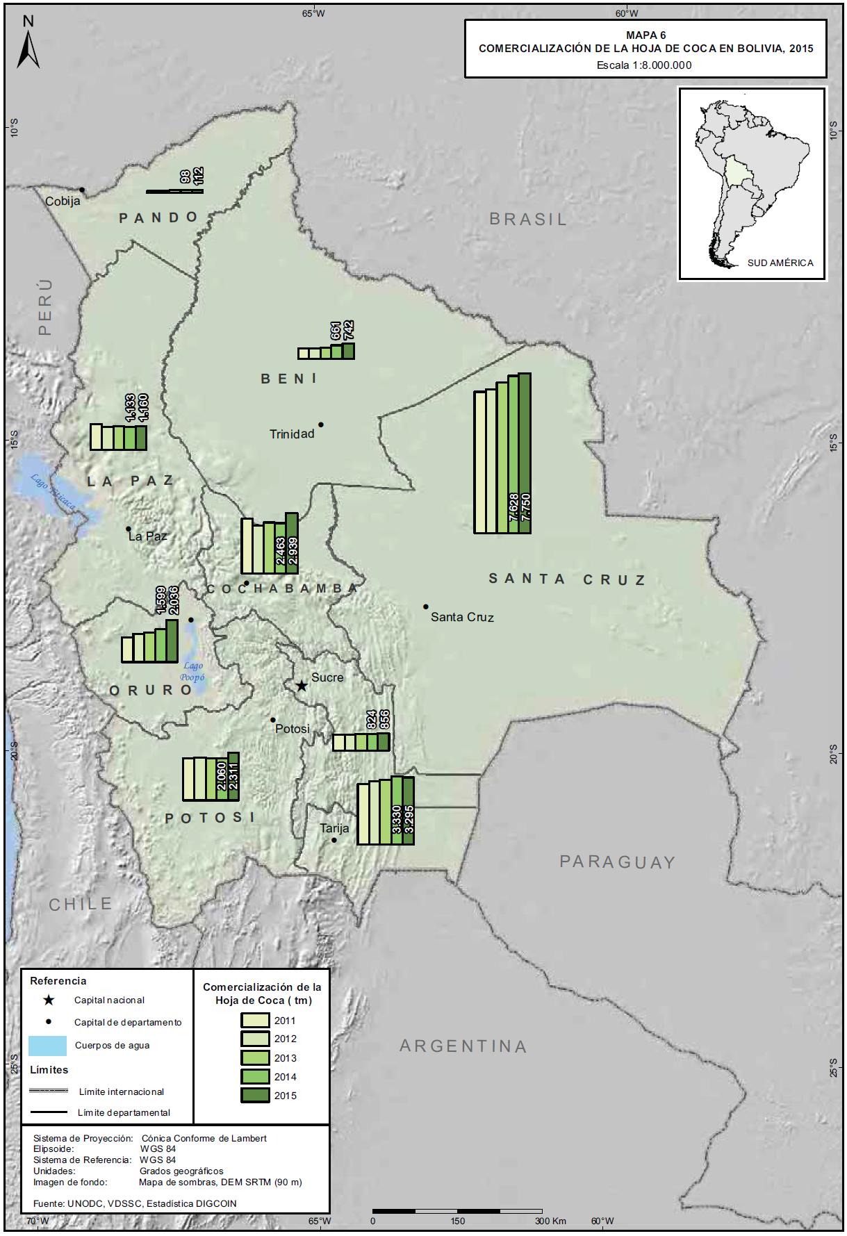 - Oficina de las Naciones Unidas contra la Droga y el Delito, Proyecto BOL/F57, Monitoreo de cultivos de coca 2014, (2015), La Paz: Autor.