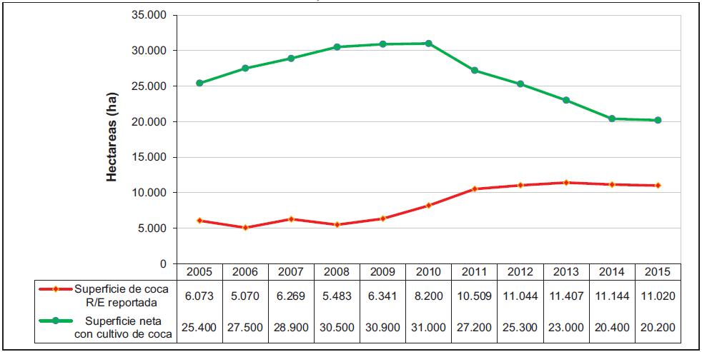 Figura 24. Superficie de Racionalización/erradicación y superficie neta con cultivo de coca, 2005 -2015