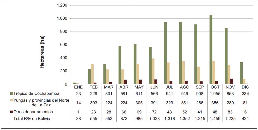 Figura 26. Datos de racionalización/erradicación del cultivo de coca en Bolivia por meses, 2015