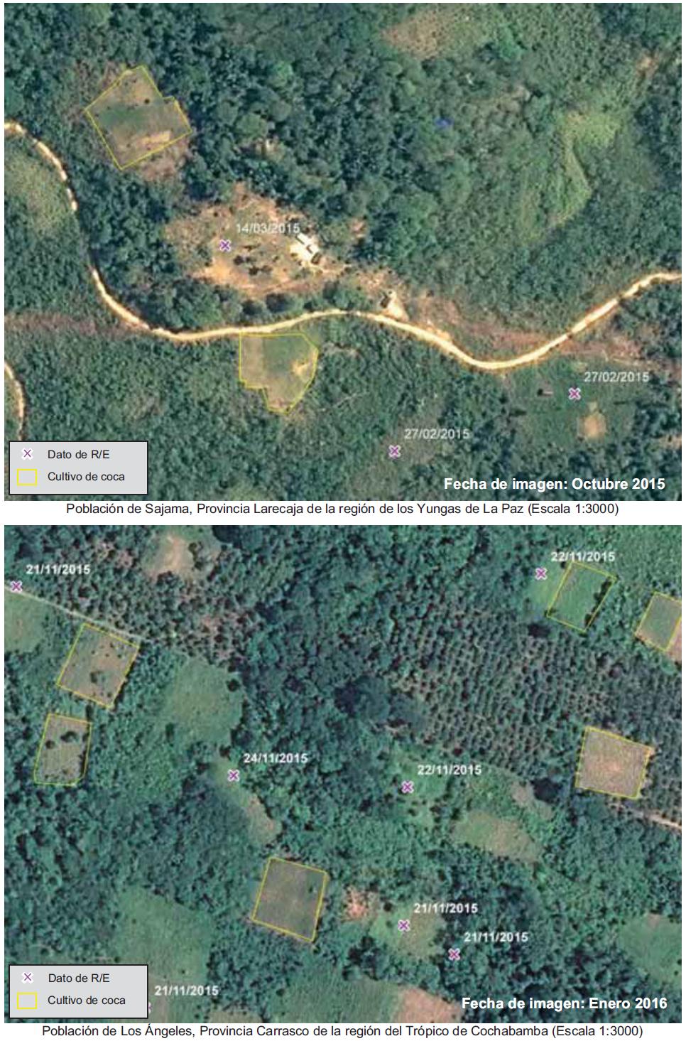 Los puntos georreferenciados de R/E proporcionados por el Gobierno de Bolivia son insumos complementarios para la interpretación de cultivos de coca. Esta información permite identificar parcelas de coca afectadas por el proceso de R/E. Los datos de R/E con fecha posterior a la toma de la imagen de satélite, no fueron considerados en la interpretación del monitoreo de cultivos de coca 2015.