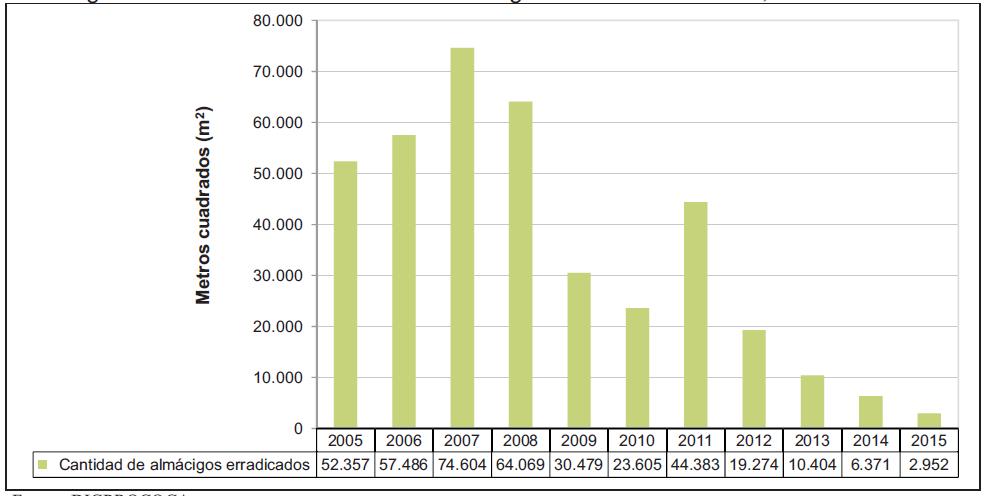 Figura 32. Erradicación anual de almácigos de coca en Bolivia, 2005 -2015