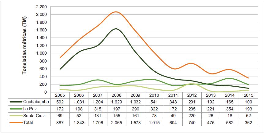 Figura 36. Incautación de cocaína en Bolivia, 2005 - 2015 (TM)