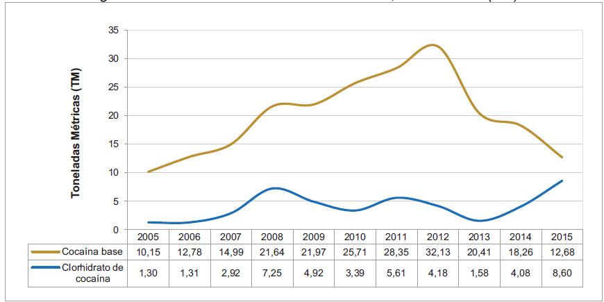 Tabla 16. Incautación de cocaína en Bolivia, 2005 -2015 (TM)