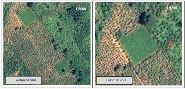 Figura 40. Vista de cultivos de coca sobre imágenes de satélite Pléiades (50 cm), escalas 1:3000 y 1:1500, en la región del Trópico de Cochabamba