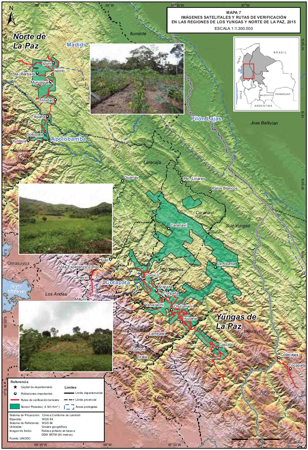Mapa 7. Imágenes satelitales y rutas de verificación en las regiones de los Yungas y Norte de La Paz, 2015 ![]()