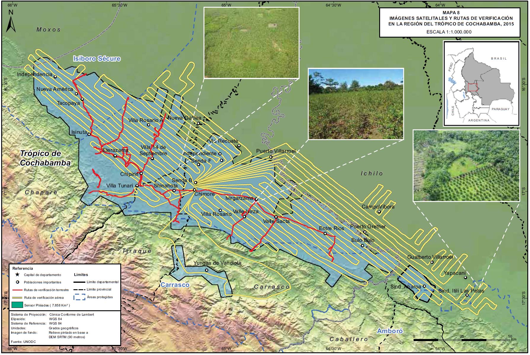 Haga click para ampliarMapa 8. Imágenes satelitales y rutas de verificación en las regiones del Trópico de Cochabamba, 2015 ![]()