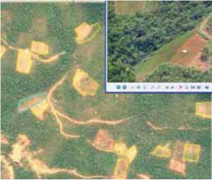 La Figura 45 y 46 muestran ejemplos de claves de interpretación visual para la región del Trópico de Cochabamba y los Yungas de La Paz, donde se observa la localización y las características del cultivo de coca en cada región, y los diferentes criterios de interpretación visual que son aplicados para identificar un cultivo de coca sobre una imagen satelital.