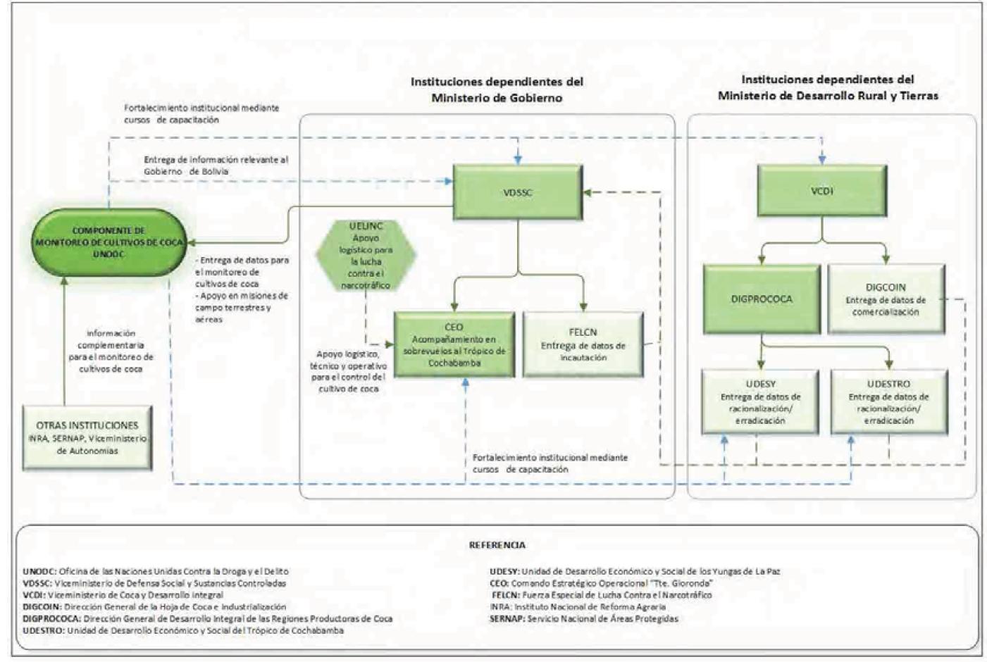 Las instituciones gubernamentales que se benefician con la información generada por el Monitoreo de Cultivos de Coca de la Oficina de la UNODC son: el Viceministerio de Defensa Social y Sustancias Controladas (VDSSC) como Secretaría Técnica del CONALTID y el Viceministerio de Coca y Desarrollo Integral (VCDI). Estas instituciones utilizan esta información para la planificación de tareas de racionalización/erradicación del cultivo de coca