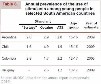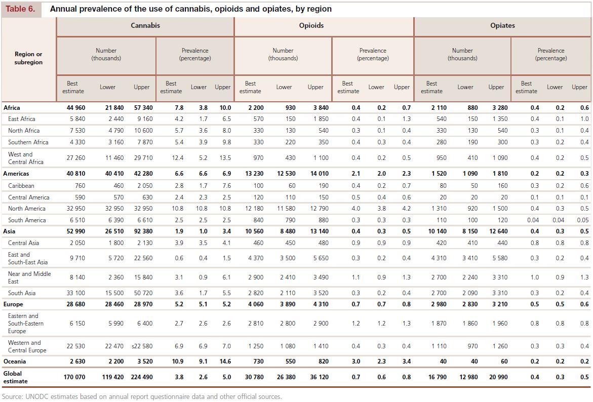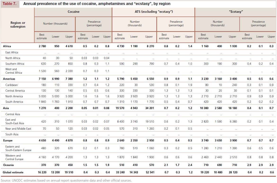 (thousands)Low High Low High Cannabis 2.6 5.0 119 240 224 490 Opioids 0.6 0.8 26 380 36 120 Opiates 0.3 0.5 12 980 20 990 Cocaine 0.3 0.4 13 200 19 510 Amphetamine-type stimulants 0.3 1.2 14 340 52 540 "Ecstasy" 0.2 0.6 10 480 28 120 Any illicit drug 3.4 6.6 153 000 300 000 Opioids