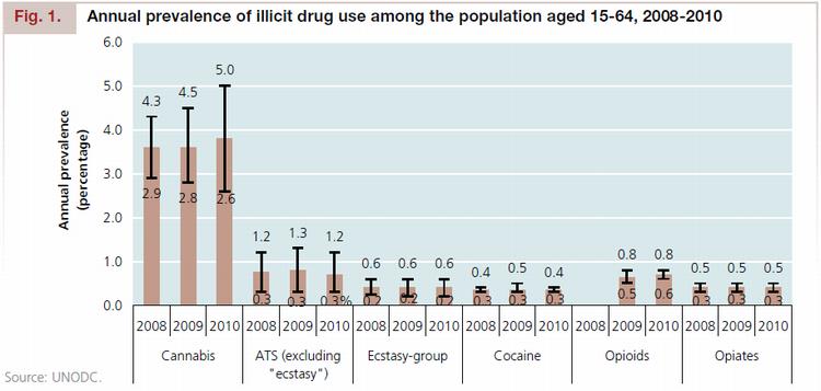 Globally, the two most widely used illicit drugs remain cannabis (global annual prevalence ranging from 2.6 to 5.0 per cent) and ATS, excluding "ecstasy", (0.3-1.2 per cent) but data relating to their production are scarce. Total production and cultivation of coca is known to be stable, while the production of opium has returned to levels comparable to 2009. Global annual prevalence of both cocaine and opiates (opium and heroin) has remained stable, with ranges from 0.3-0.4 per cent and 0.3-0.5 per cent, respectively, of the adult population aged 15-64: