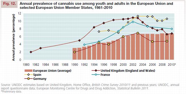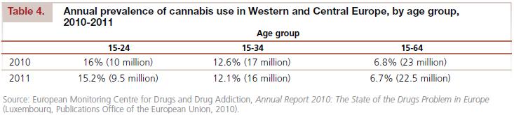 218. The far lower figures reported for Italy for 2010 were not included in the calculations of the European Union average as the Italian 2010 survey results were not directly comparable to those of previous years. Including the latest Italian figures would have yielded an overall cannabis prevalence rate for the European Union of 5.7 per cent. [Back]