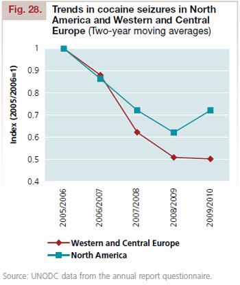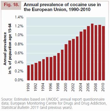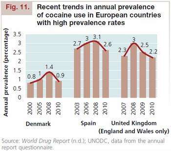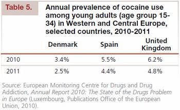 232. Data for Italy showed a decline in the cocaine prevalence rate from 2.1 per cent in 2008 to 0.9 per cent in 2010; data for Spain showed a decline from 3.1 per cent in 2007 to 2.7 per cent in 2009; and data for the United Kingdom (England and Wales) showed a decline from 3 per cent in 2008/09 to 2.1 per cent in 2010/11. (For Italy, given methodological changes, a very low response rate (12 per cent) and marked declines in the lifetime prevalence rates (which is impossible unless a large number of cocaine users had died or left Italy between 2008 and 2010), the most recent data were not included in the calculation of the European averages.) [Back]