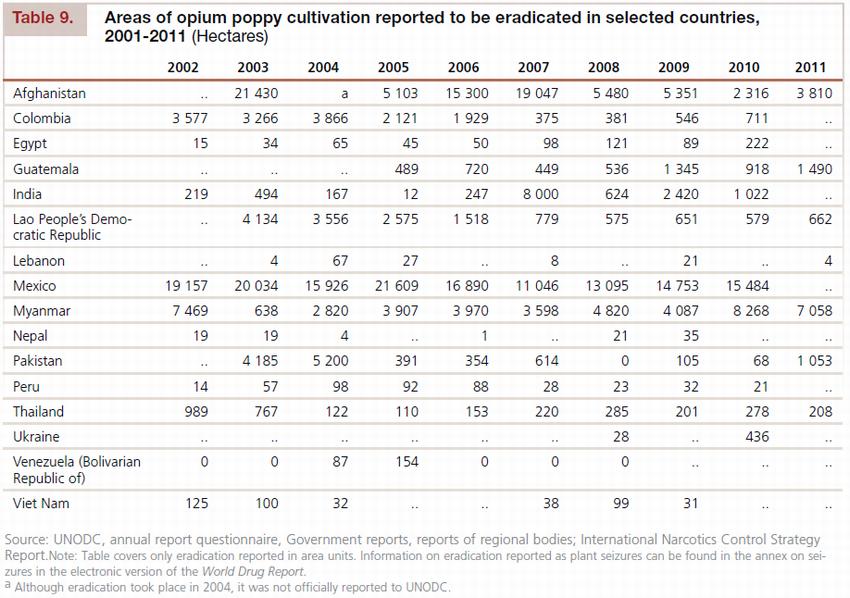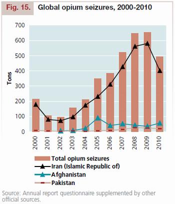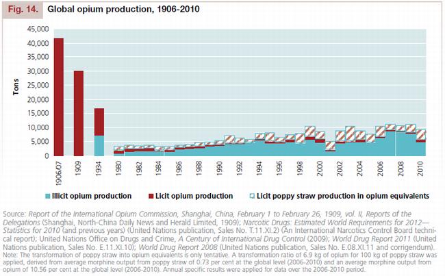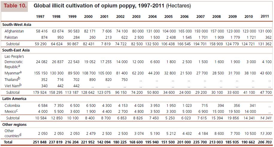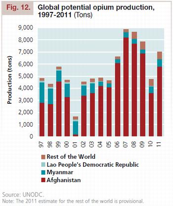 Global opium production amounted to 7,000 tons in 2011. That is more than a fifth less than the peak of 2007 but an increase from the low level of 2010, the year in which a plant disease destroyed almost half of the opium harvest in Afghanistan, which continues to be the world's biggest producer. The total area under coca bush cultivation in the world fell by 18 per cent between 2007 and 2010 and by 33 per cent since 2000. Efforts to reduce cultivation and production of the main plant-based problem drugs have, however, been offset by rising levels of synthetic drug production, including significant increases in the production and consumption of psychoactive substances that are not under international control.