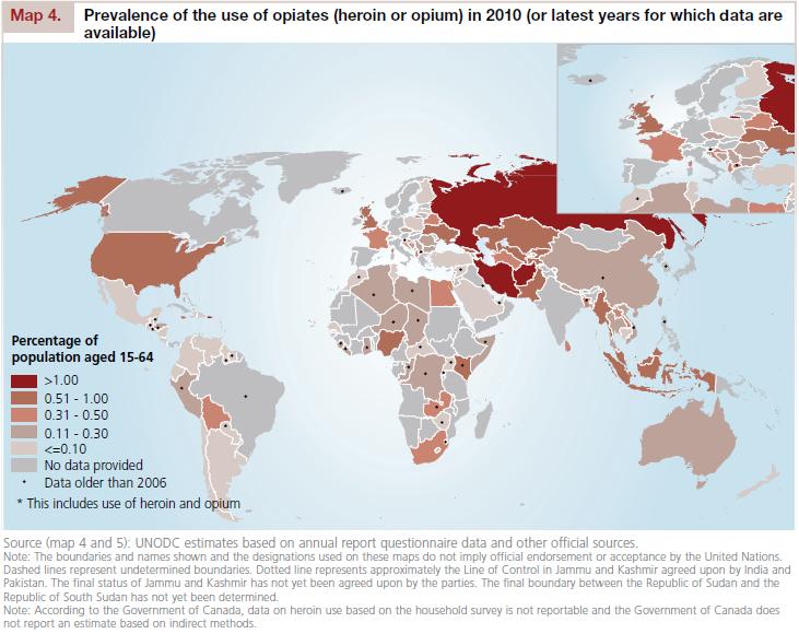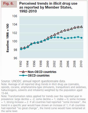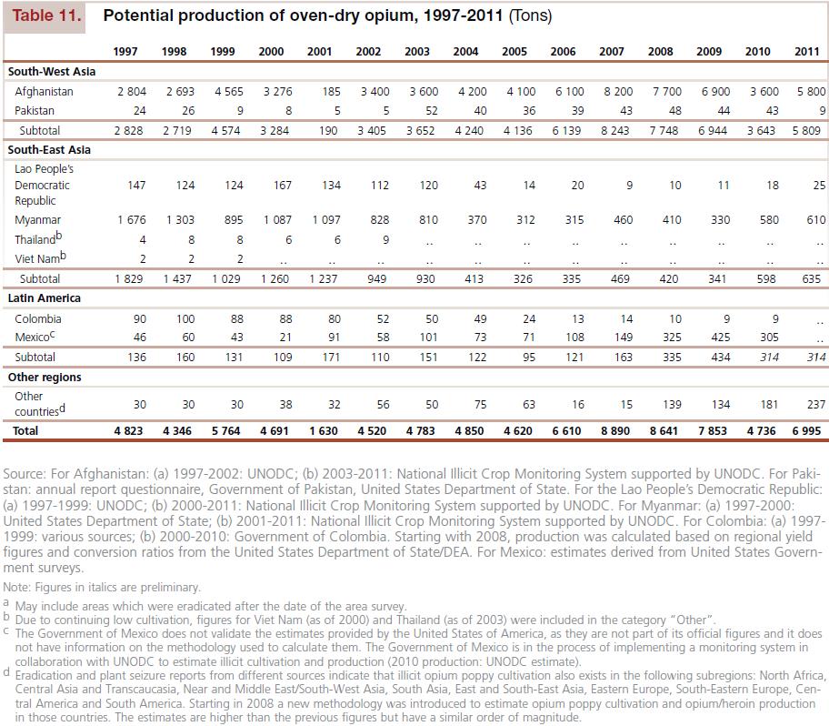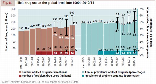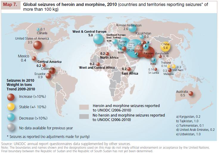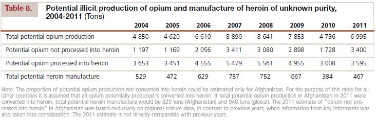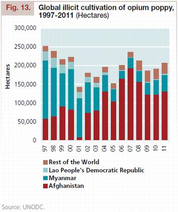 Latest available data indicate that there has been no significant change in the global status quo regarding the use, production and health consequences of illicit drugs, other than the return to high levels of opium production in Afghanistan after a disease of the opium poppy and subsequent crop failure in 2010. But while the troubled waters of the world's illicit drug markets may appear to be stagnant, shifts and changes in their flows and currents can be observed below the surface. These are significant and also worrying, not because of how they currently impact on the data but because they are proof of the resilience and adaptability of illicit drug suppliers and users and because of the potential future repercussions of those shifts and changes in the world's major drug markets.