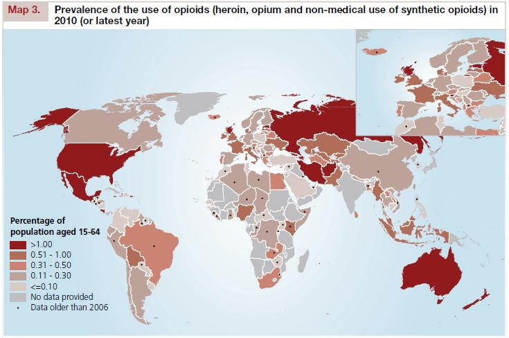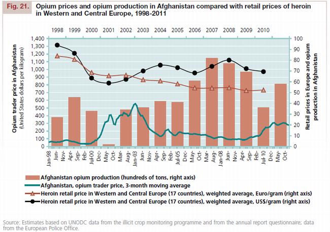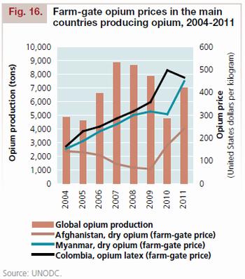 With estimated annual prevalence ranging from 0.6 to 0.8 per cent of the population aged 15-64, the use of opioids (mainly heroin, morphine and non-medical use of prescription opioids) is stable in all of the main markets. After a blip in global production in 2010, caused by a disease of the opium poppy in Afghanistan, production has now more or less returned to its 2009 level. Average wholesale and retail prices in the most regularly monitored markets for opiates, in Western and Central Europe and the Americas, have also shown little change since 2009, but this does not reflect the situation seen in such major opium-producing countries as Afghanistan and Myanmar where, despite an increase in opium production, farm-gate prices continued to rise in 2010 and 2011.